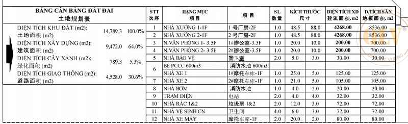 Nhà xưởng 1: DTXD 9.236m2. Kết cấu 1 trệt 1 lầu (mỗi sàn 4.268m2). Tích hợp văn phòng điều hành 3.5 tầng rộng 700m2.